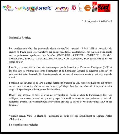 Dans ces conditions, par trop préjudiciables aux intérêts des candidats et bien peu respectueuses du dialogue social, l'ensemble des organisations syndicales a refusé de siéger et demandé la tenue de ce groupe de travail la semaine prochaine, en présence des corps d'inspection.